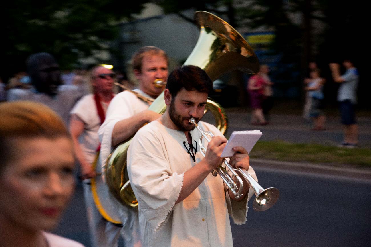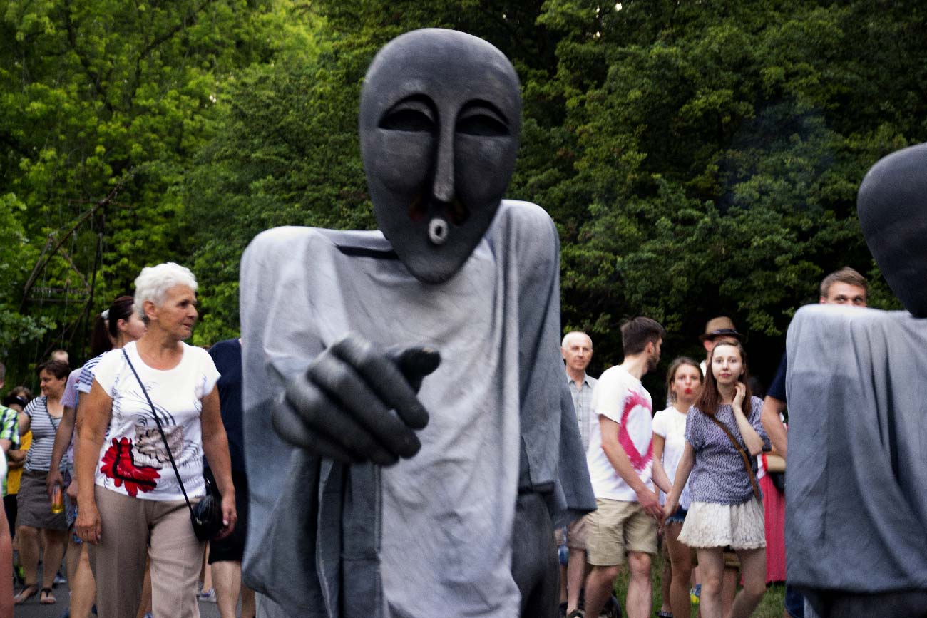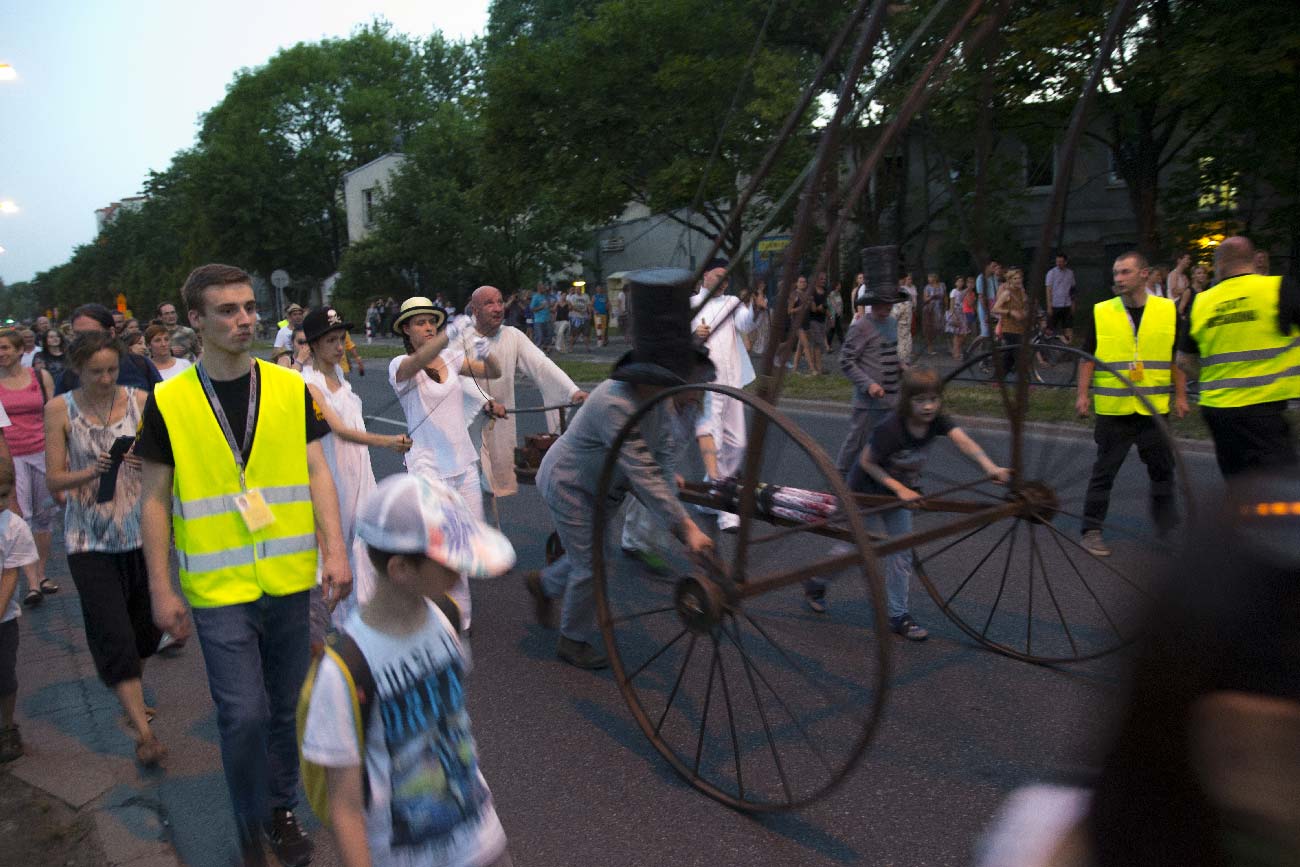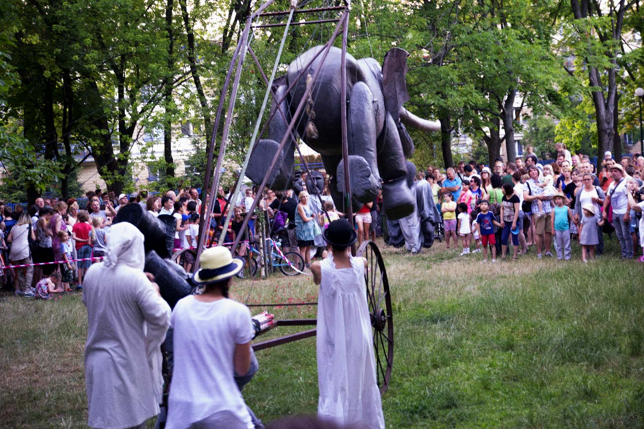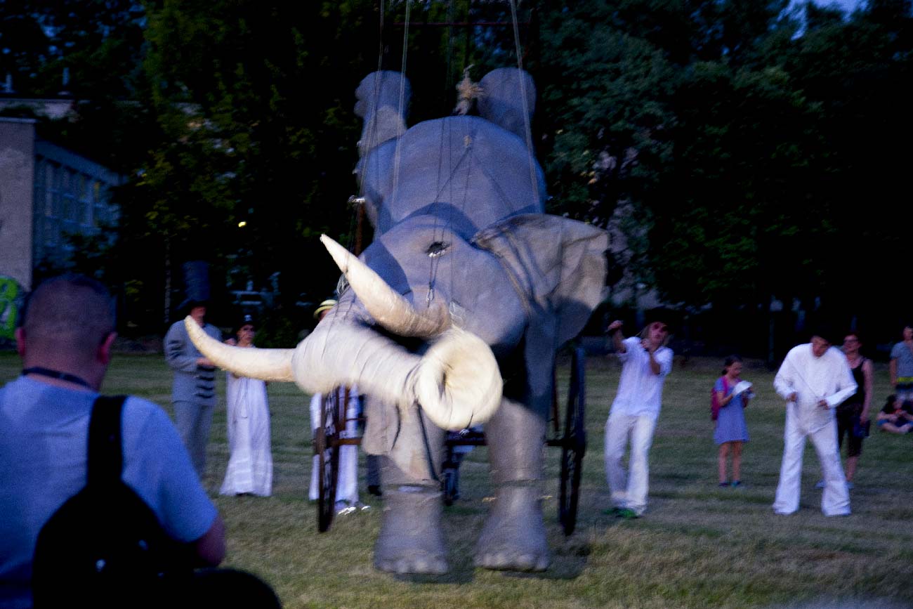 To nie było przedstawienie, choć był teatr. To była parada, może spacer ze słoniem. Przy zapadającym zmroku maszerowaliśmy ulicami Warszawy. Mając za towarzysza tego spaceru przeogromnego słonia. To było fajne, bo fajnie coś robić razem, choćby spacerować. A słoń był tu małym pretekstem do tego.